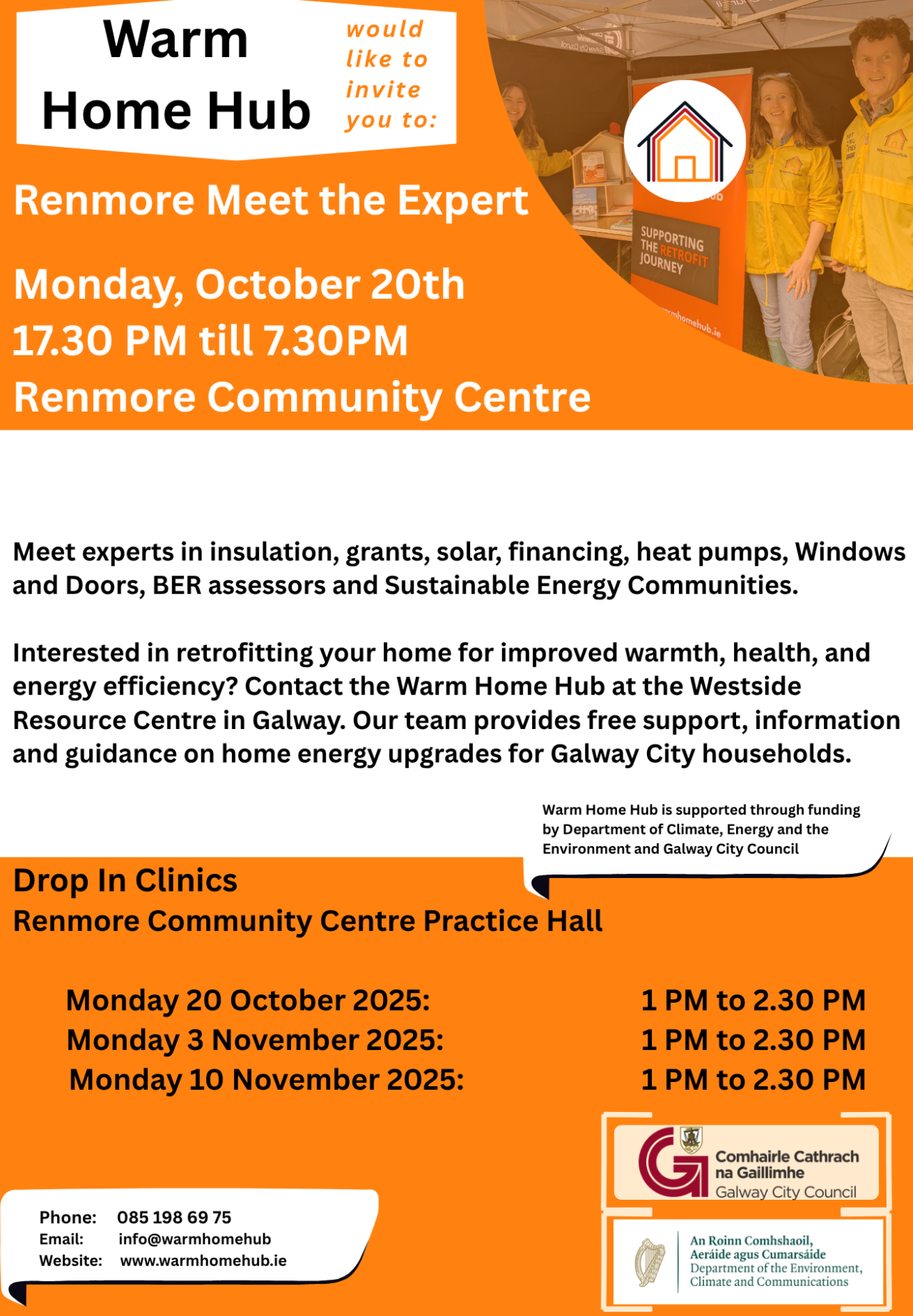 We are running two Meet the Expert Events in Renmore on 20th Oct and Westside on 11 Nov. The events are intended for anyone living in Galway City. Additional to these, we are also running Drop-In-Clinics in Renmore and Westside in October and November. More to follow.